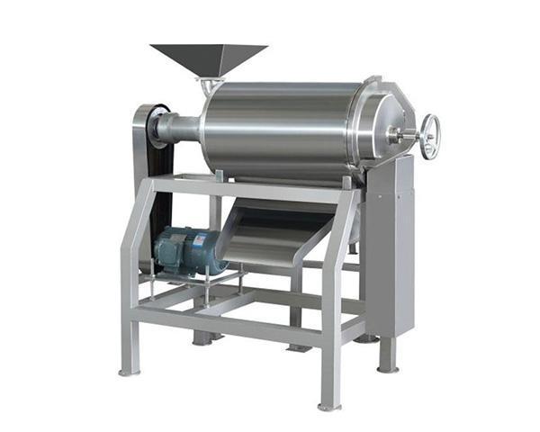 打漿機:電動機通過皮帶傳動,使安裝在花鍵上的刮板高速旋轉,當經過破碎的水果通過進料口進入機內時,接漿盤就把物料均勻排發到刮板和篩網處。由于刮板的回轉作用和導程角的存在,使物料沿著圓筒向出口端移動,移動的軌跡呈螺旋狀,物料就在刮板和篩筒之間移動過程中受離心力的作用而被擦碎,汁液和肉質(已成漿狀)從篩孔中通過送入下道工序,(雙道打漿機為聯動重復上列過程)皮和籽等則從出渣斗排出,以達到自動分離的目的。只要變換不同規格的篩網以及調整刮板導程角的大小,可改變不同的打漿速度,獲得滿意的效果。