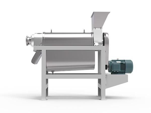 ★ 原料加入進(jìn)料斗中,在螺旋的推進(jìn)下受壓,其壓榨的汁液通過(guò)過(guò)濾網(wǎng)流入底部的盛汁器,而渣則通過(guò)螺旋與調(diào)壓頭的錐形部分之間形成的環(huán)狀空隙排出,調(diào)壓頭沿軸向的移動(dòng)可調(diào)整空隙的大小。用手順時(shí)針(從設(shè)備的出渣槽向進(jìn)料斗端看)轉(zhuǎn)動(dòng)手輪軸承座時(shí),調(diào)壓頭向左,空隙即縮小,反之則空隙變大。改變孔隙的大小,即調(diào)整排渣的阻力,即可改變出汁率。但如果孔隙過(guò)小,在強(qiáng)力擠壓下,部分渣的顆粒會(huì)和汁一起通過(guò)過(guò)濾網(wǎng)被擠出,盡管出汁率增加,但汁的質(zhì)量相對(duì)下降,因此孔隙的大小應(yīng)視用戶的具體工藝要求而定。