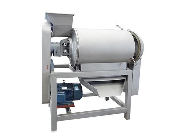 電機通過三角帶傳動,使安裝在花鍵軸上的刮板高速旋轉(zhuǎn),當經(jīng)過破碎的水果通過進料口進入機內(nèi)時,擋漿盤將物料均勻排發(fā)到刮板和篩網(wǎng)之間,由于刮板的回轉(zhuǎn)作用和導(dǎo)程角的存在,使物料沿著園筒向出口端移動,移動的軌跡呈螺旋狀,物料就在刮板和篩網(wǎng)之間移動過程中受離心力的作用而被擦碎,汁液和肉質(zhì)(已成漿狀)從篩孔通過進入下道工序(雙道打漿機為聯(lián)動重復(fù)上列過程),皮和籽等則從出渣斗排出,從而達到自動分離的目的。只要變換不同規(guī)格的篩網(wǎng)以及調(diào)整刮板導(dǎo)程角的大小,可改變不同的打漿速度,獲滿意的效果。