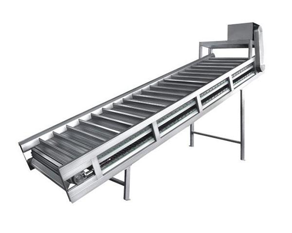 ★該機(jī)的輸送鏈部分有三種組成型式:a、折邊平板+擋板固定在帶彎板鏈條組成,鏈條為大滾子鏈,滾珠在耐磨塑料墊條上作滾動(dòng)摩擦,噪音小,經(jīng)久耐用;b、符合食品衛(wèi)生的聚酯網(wǎng)帶+擋板的組成;c、注塑成型的符合食品衛(wèi)生的塑料鏈板和銷軸直接組裝而成,具有重量輕、拆裝方便等特點(diǎn);